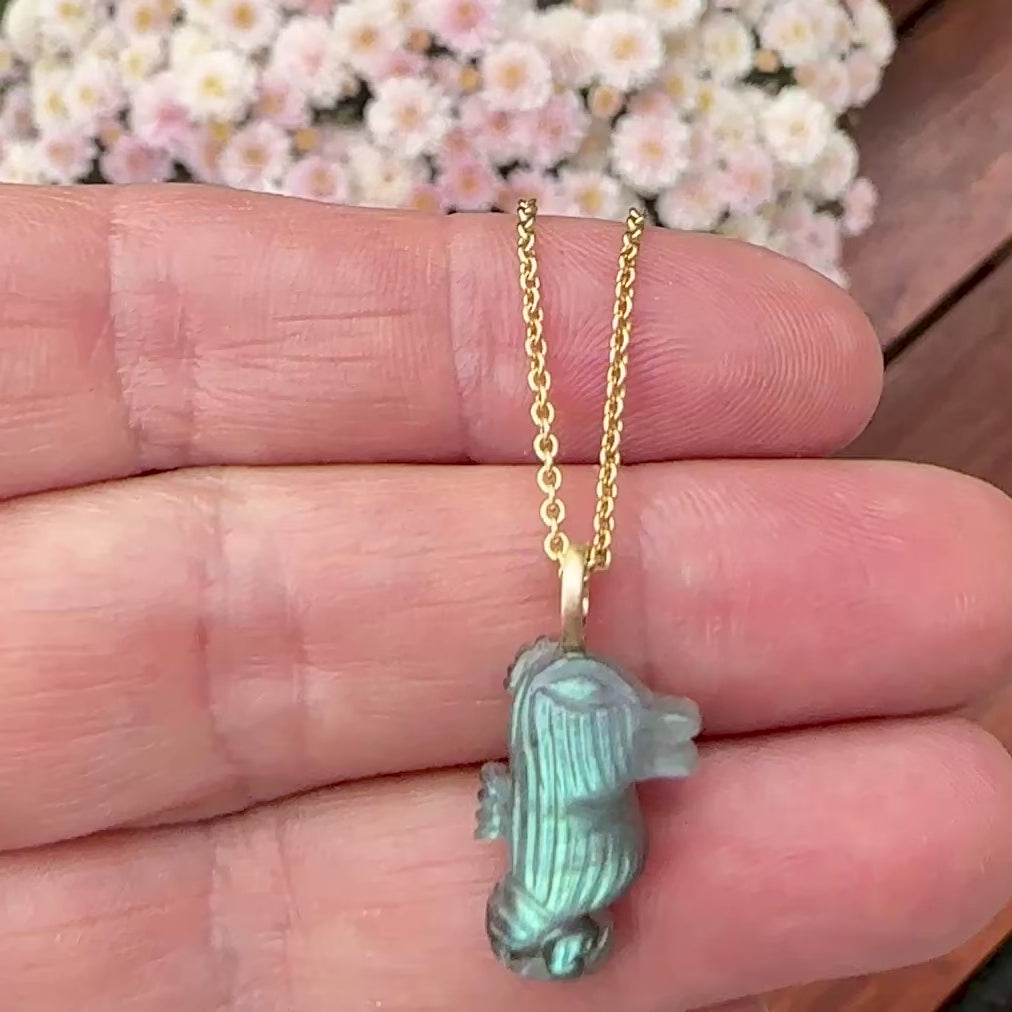 14 kt. vedhæng med søhest af blå, grå, sort changerende labradorit.