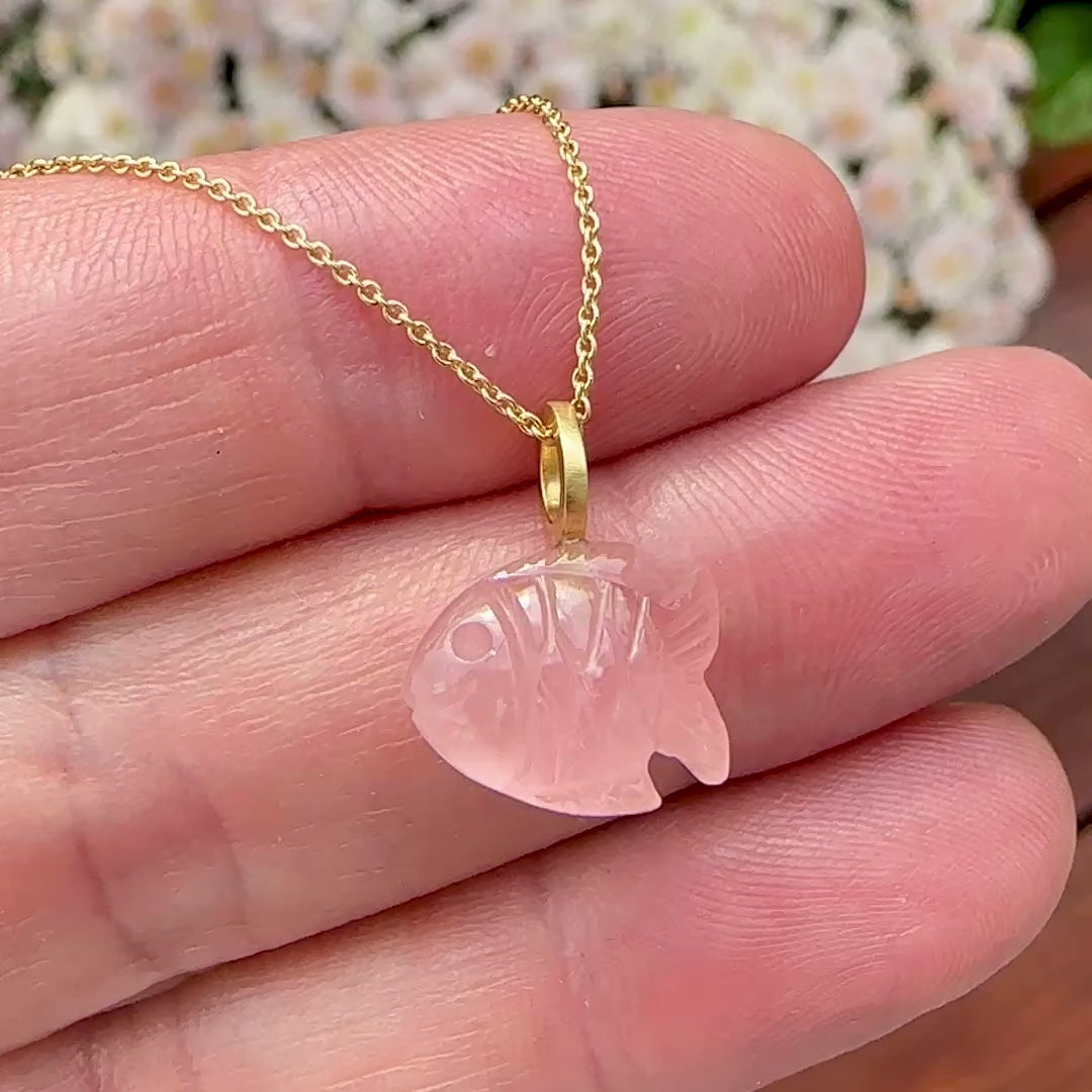 18 kt. vedhæng med fisk af rosa rosakvarts.