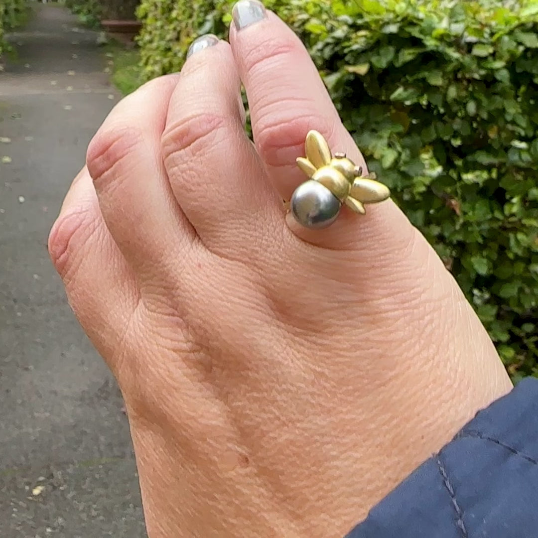 18 karat massiv guld humlebi ring med tahiti perle og diamanter