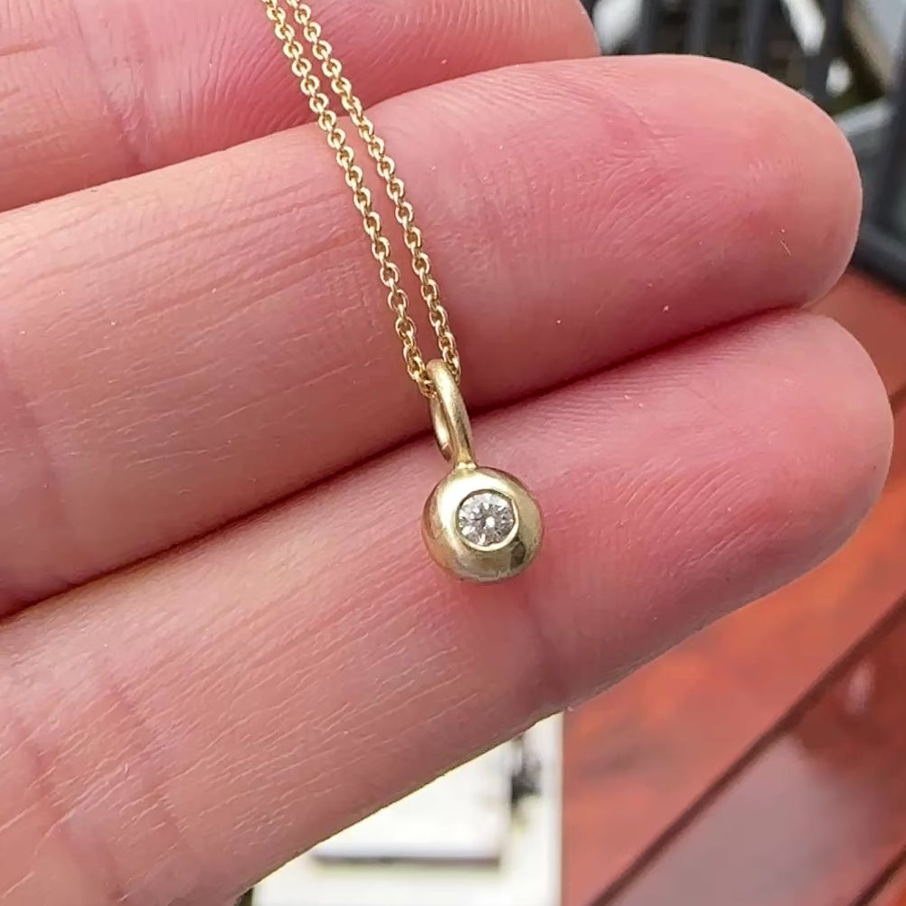 Håndlavet dråbe vedhæng i massiv 14 kt guld med en fin hvid diamant. Den matte, børstede overflade giver et fint spil til den skinnende diamant.