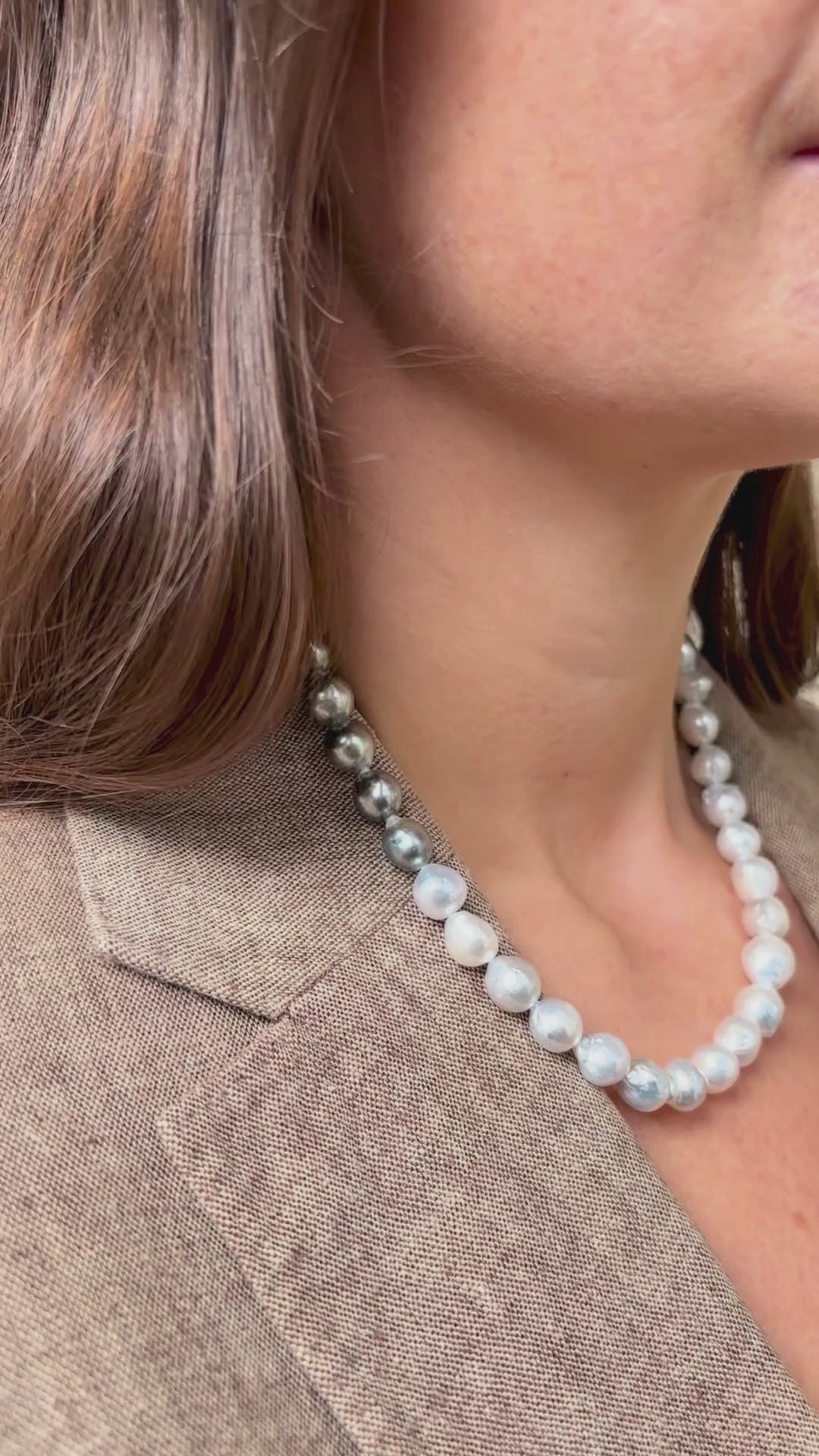 En fin kombination af sølvtonede hvide australske saltvandsperler og Tahiti perler. Begge perletyper er udvalgt i et harmonisk farveforløb, hvor nuancerne bevæger sig fra køligt sølv til dybere, mørke toner.